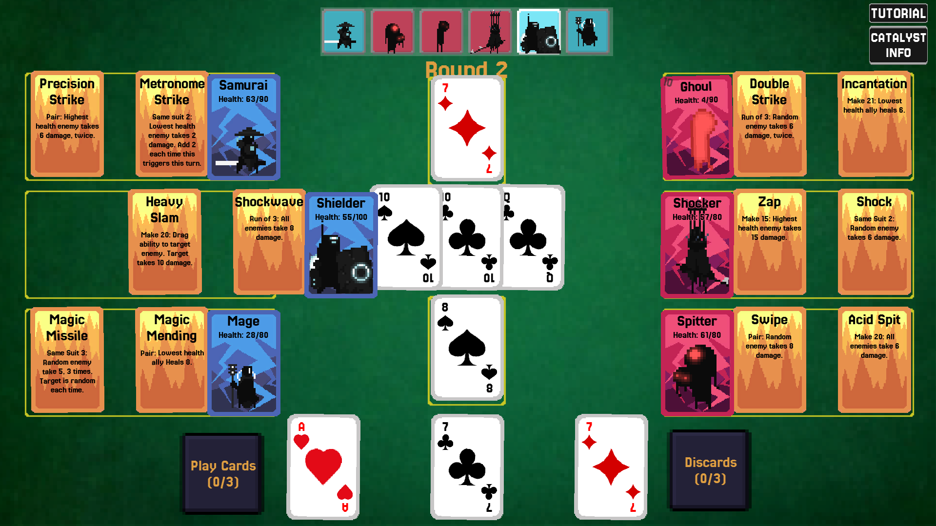 Catalyst is a demo of a 3v3 turn based battler where you play cards to activate your character's attacks.